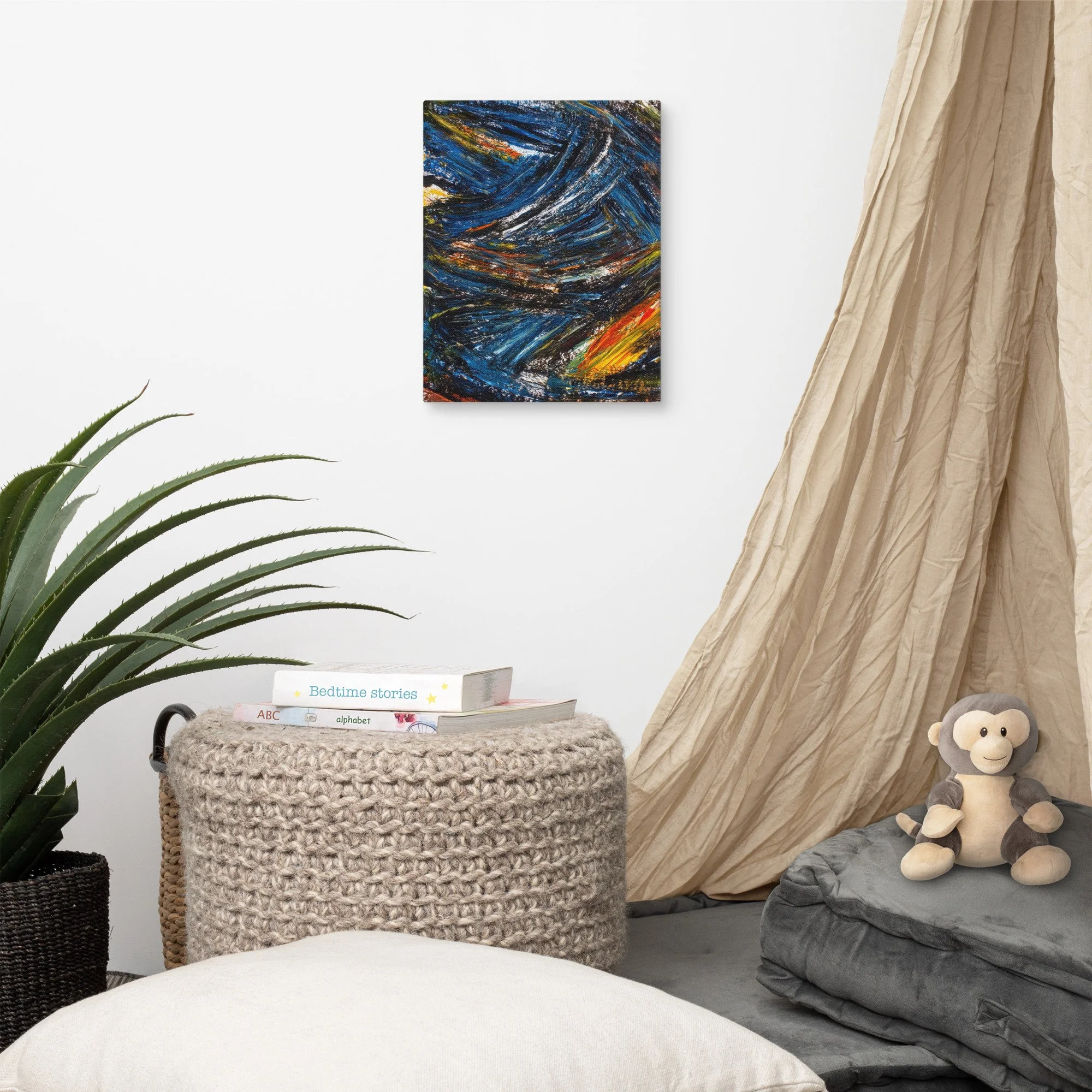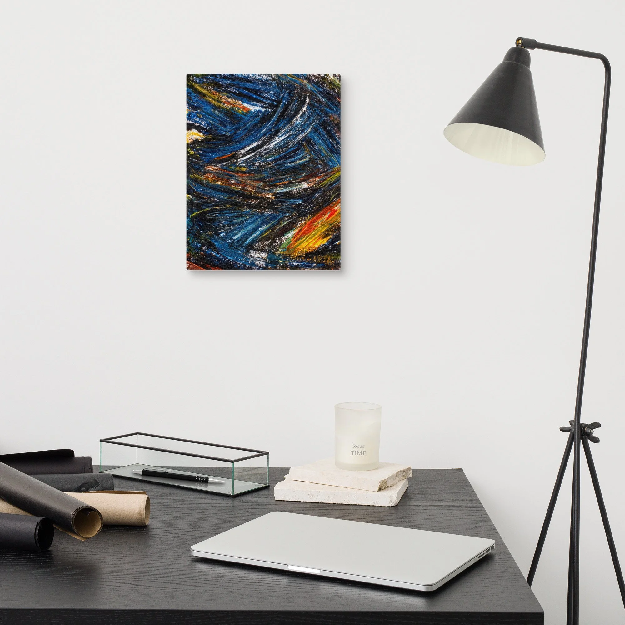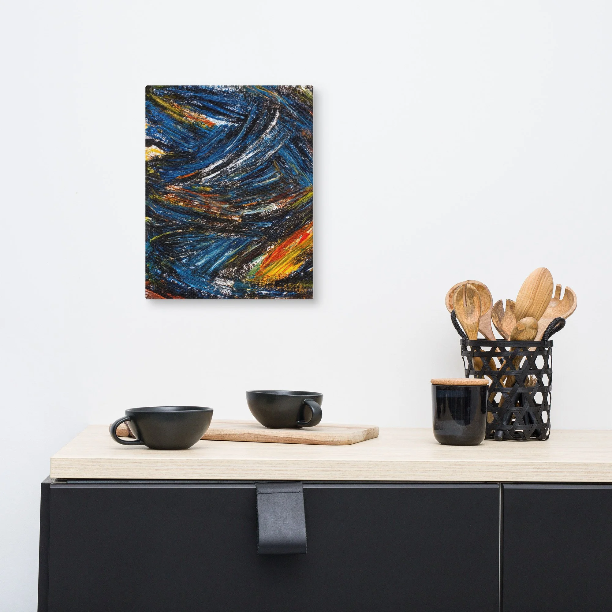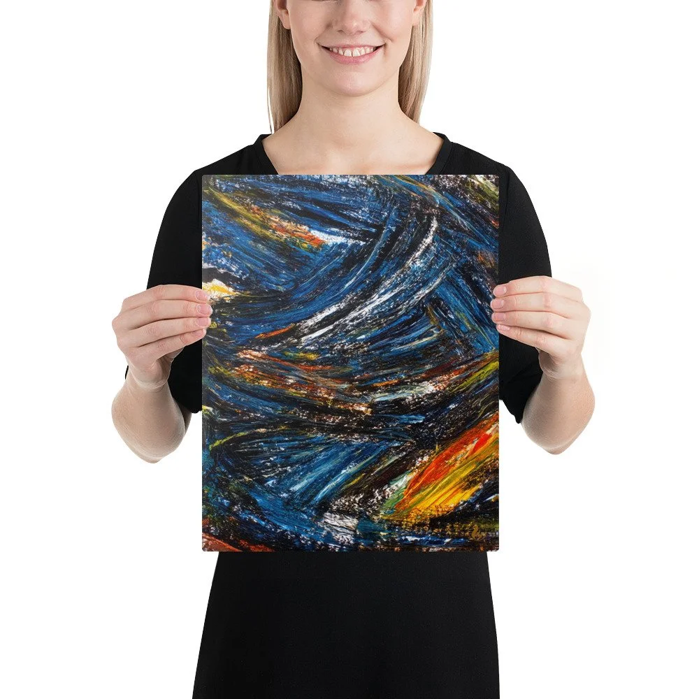 “Turbulent Grace” is a symphony of motion — swirling blues and streaks of fire collide in a dance of chaos and calm. Each brushstroke pulses with energy, layered in impasto textures that evoke both elegance and upheaval. This piece explores the paradox of beauty within disorder, the rhythm beneath the storm, and the grace that emerges from turbulence. Perfect for modern interiors, creative spaces, and collectors of expressive abstract art. Looking to add a little flair to your room or office? Look no further - this canvas print has a vivid, fade-resistant print that you're bound to fall in love with.